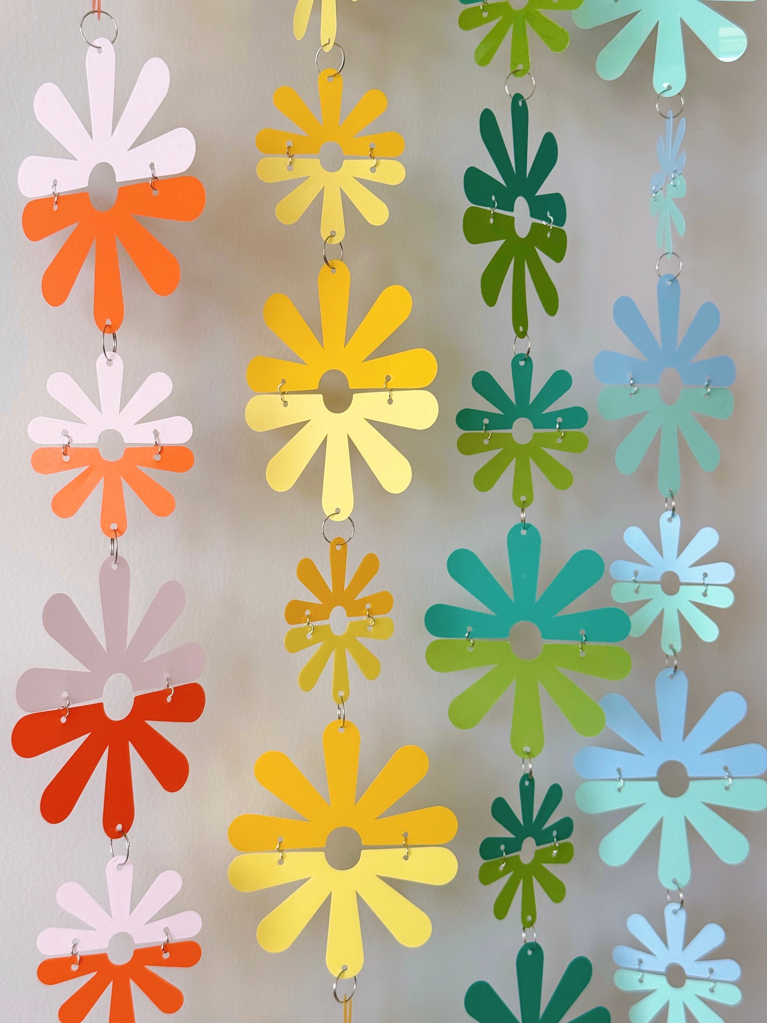 レトロポップな雰囲気のバイカラーのお花をデザインしたモビールののれんです。