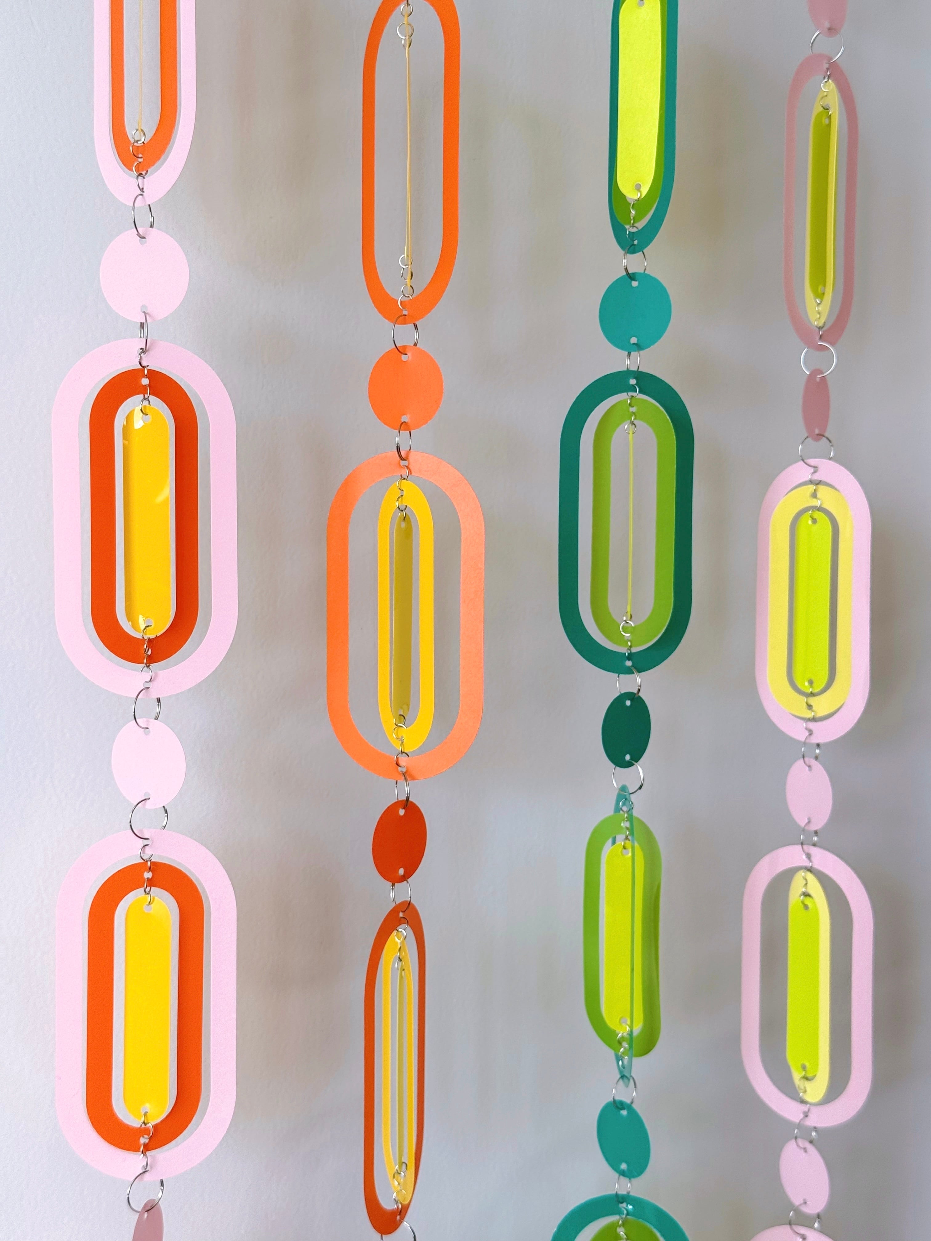 レトロでスペーシーな虹をイメージしたサークルが連なるモビールののれんです。