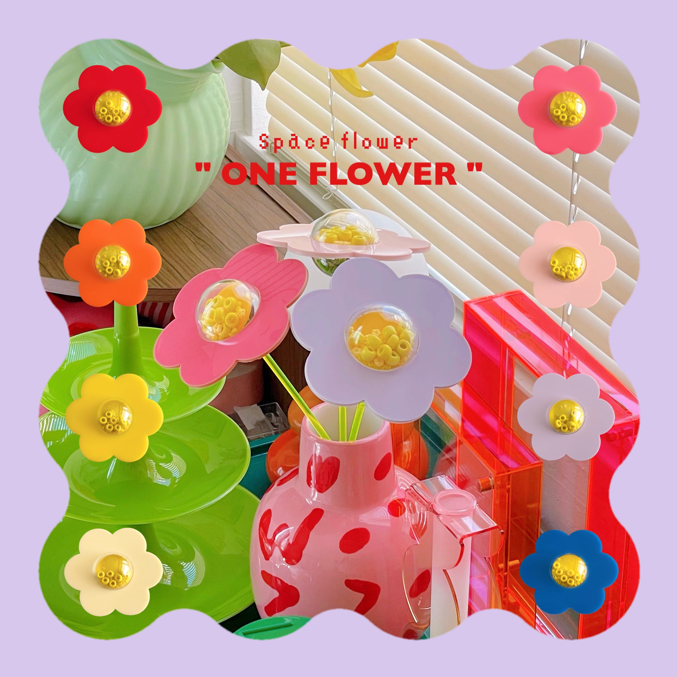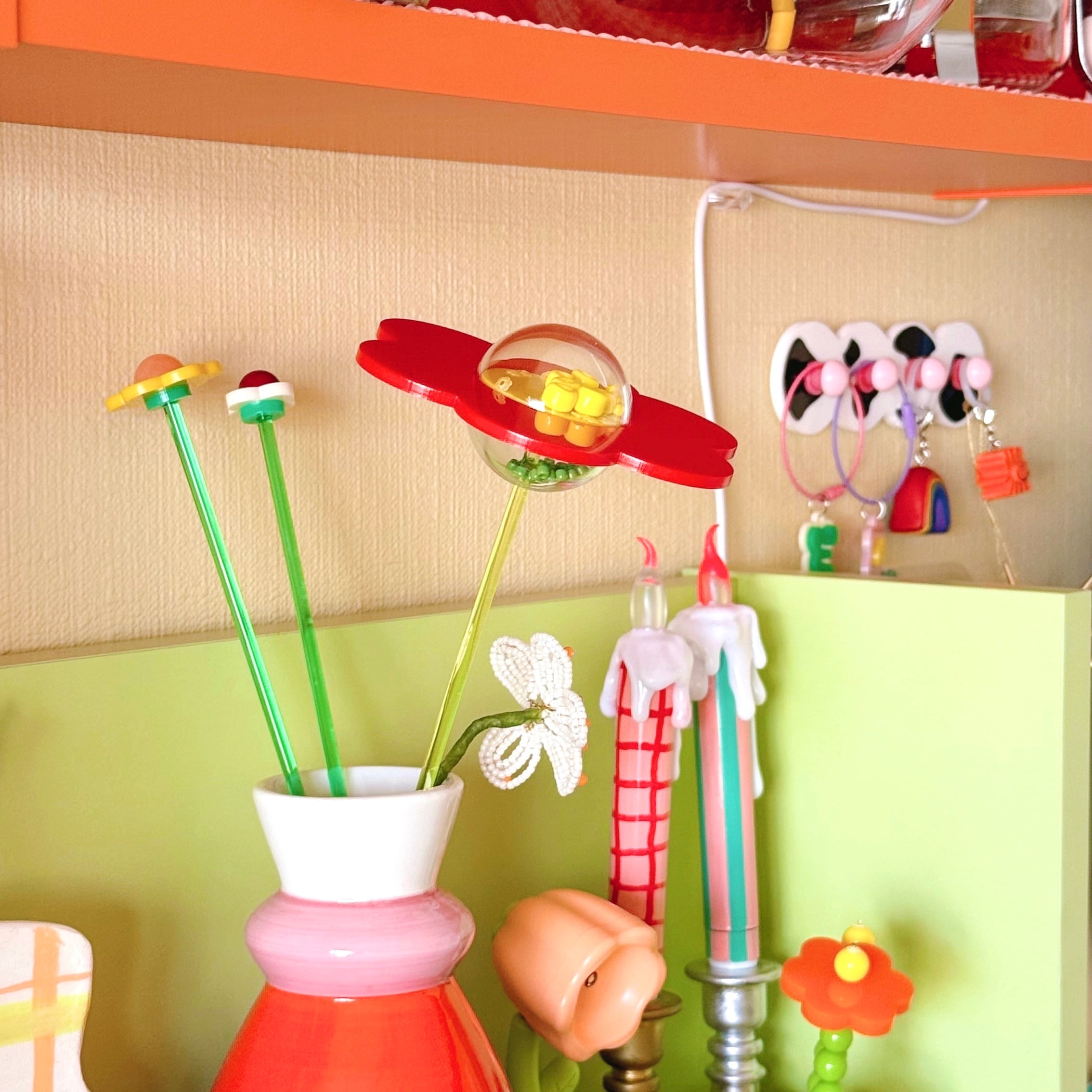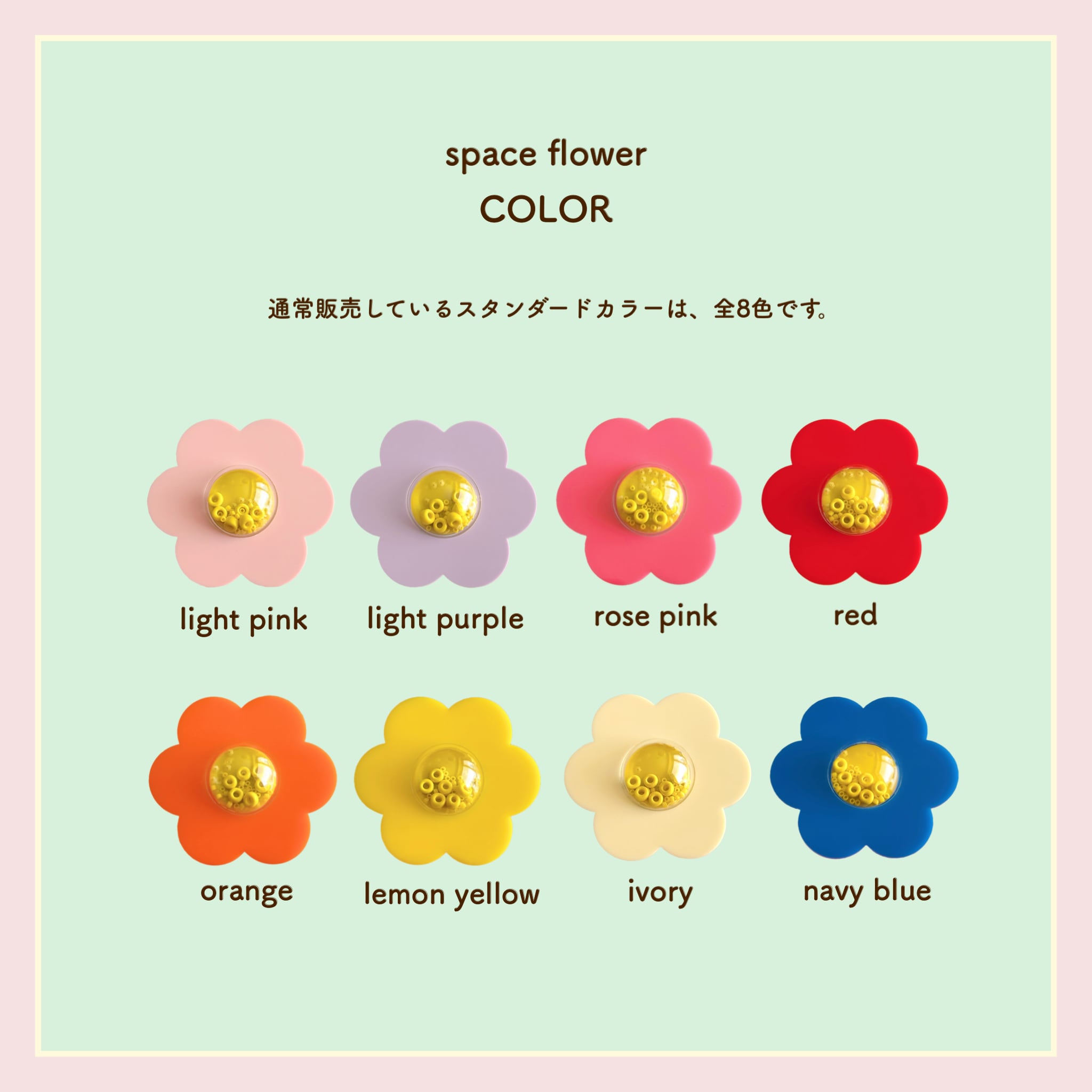 中央にまんまるなカプセルをあしらったアクリルのお花「space flower」です。