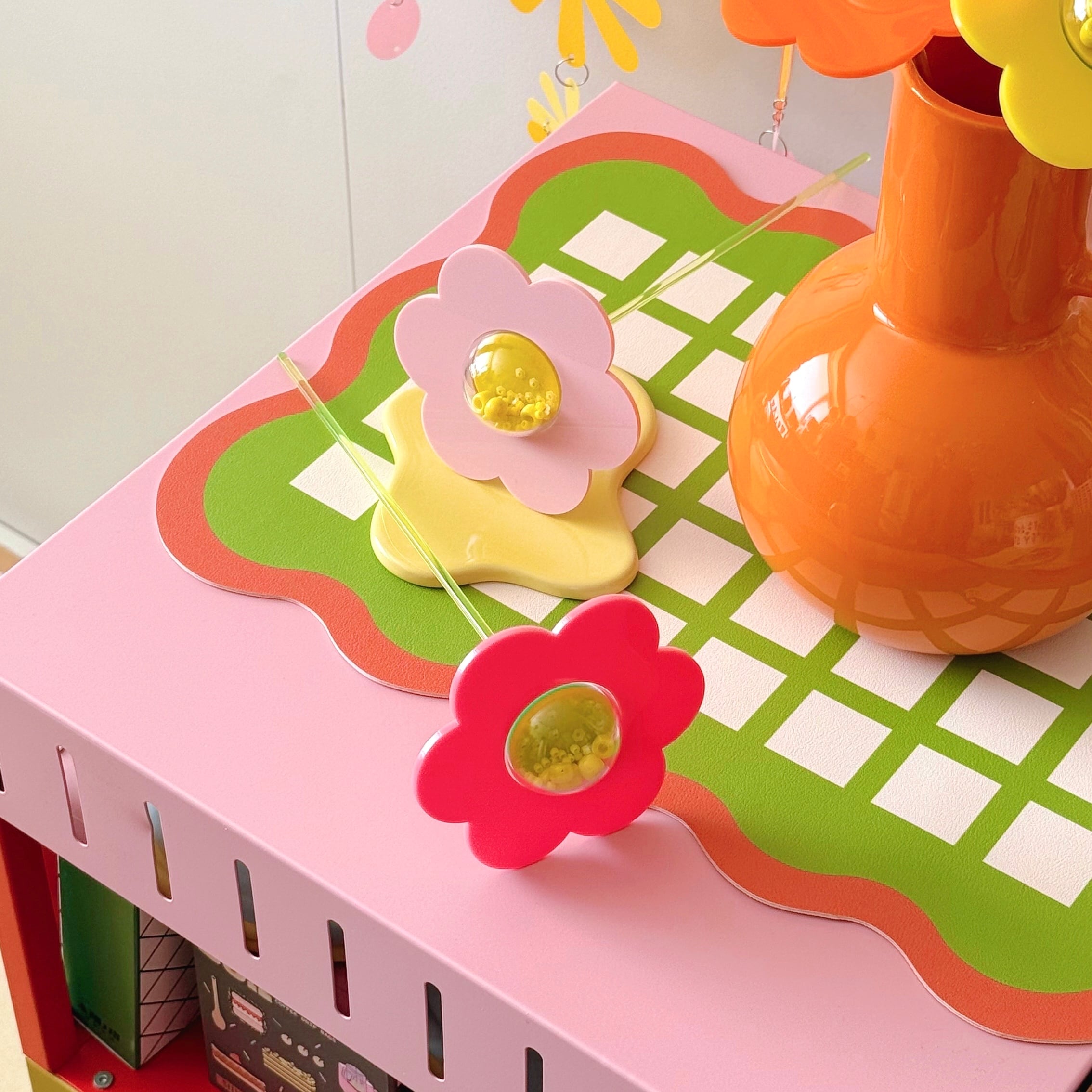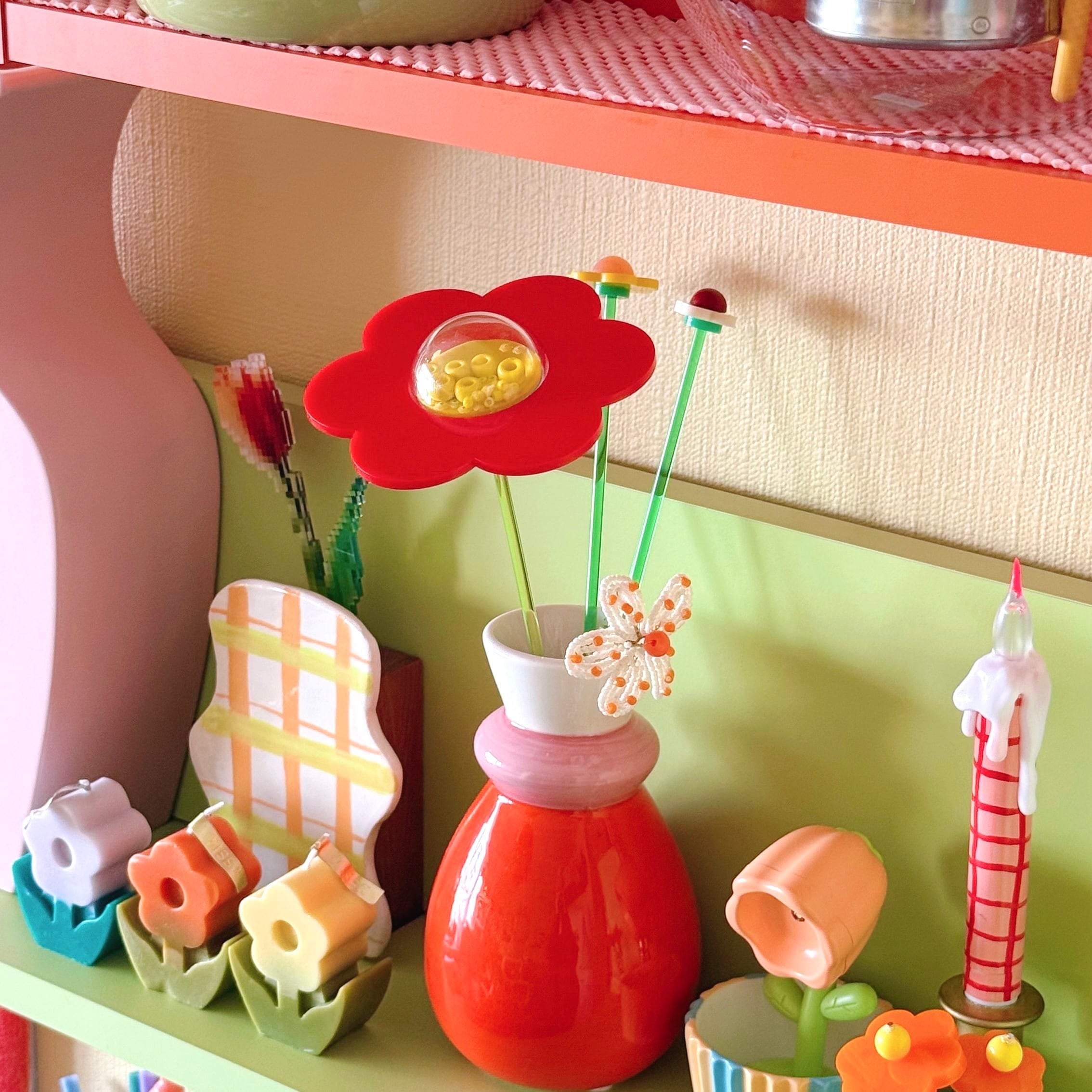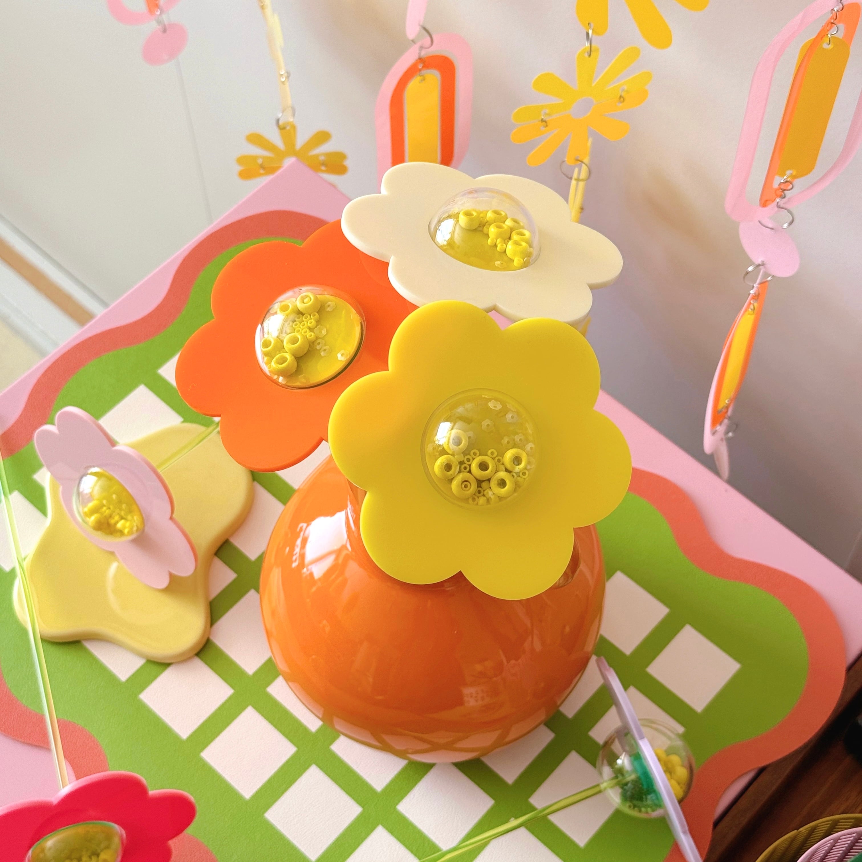 中央にまんまるなカプセルをあしらったアクリルのお花「space flower」です。
